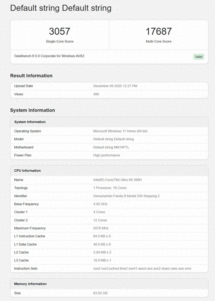 从Geekbench 6.5曝光的测试数据来看,这款搭载于“NM14PTL”主板的16核处理器,单核跑分达3057分,多核跑分17687分。这一成绩使得这款下一代旗舰处理器不仅超越了前代Arrow Lake-H架构的Core Ultra 9 285H,性能提升约15%至19%。